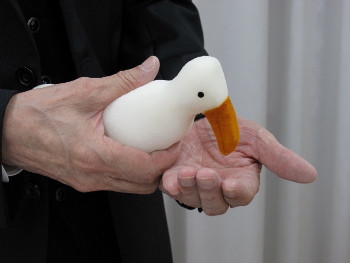 マジシャンは、2つの白いボールをそれぞれの手に1つずつ持っています。両手のボールを一緒にして手のなかで揉むようなジェスチャーをして、ゆっくりと揺らします。そして手を広げると、なんと!ボールはアヒルに変化してしまいます。または、ボールをタマゴに例えて、手の中で温めると、アヒルになってしまうという演出も可能です。