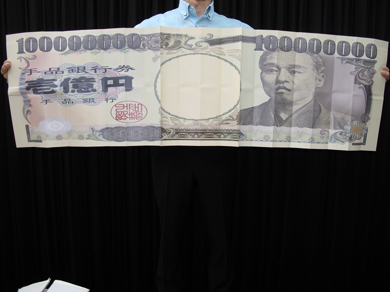 限定復刻版 by藤原邦恭 新札発行に伴い値下げ! 例えば1枚のお札をよく示し、、札入れに入れようとするとなんと、お札が扇状になって沢山現れます。そしてその扇が、一瞬に巨大化してしまいます。さらにさらに、一旦閉じおまじないを掛けると、なんと超巨大なお札に変化します。舞台で行うお札マジックの最強トリックですね。 ファン① 直径42cmの半円 ② 直径84cmの半円 巨大紙幣 約140cm