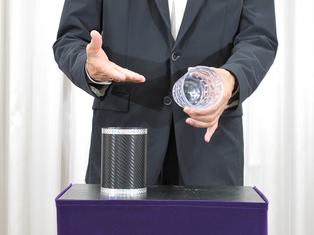 おしゃれなクリスタル調のグラスと、黒い筒があります。グラスは完全にからであることを示します。そこへ胸元やテーブルなどから取り出した4枚の結ばれたシルクを取り出します。