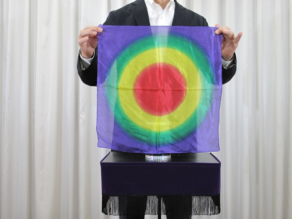 現象はまだまだ続きます。グラスの中を改め、また4枚のシルクを今度は結ばれたまま丸めていき、またグラスに戻してみましょう。再びおまじないをかけると・・・、最後は4枚のシルクが見事に交わって綺麗なレインボーシルクになってしまいます。もちろん最後は筒もグラスも空であることを示して終わります。