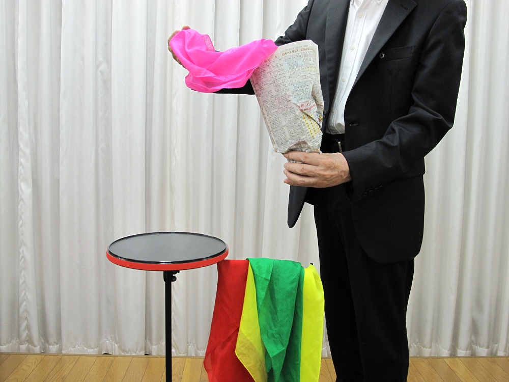 ボトルの底がない、いわゆるボトムレスですから、中に色々なものを入れて、プロダクションができるのが特徴です。解説では、新聞紙や紙袋を使った、とっても効果的な手順を紹介しています。例えば、新聞紙を改めて丸めます。そこにおまじないをかけると、中からカラフルなシルクが何枚も出てきます。さらに大きなクス玉まで・・・・。そして最後にはボトルが出てくるという流れが演じられます。そして、最大の発見があります!なんと!缶ビールなどの缶がぴったりと入る