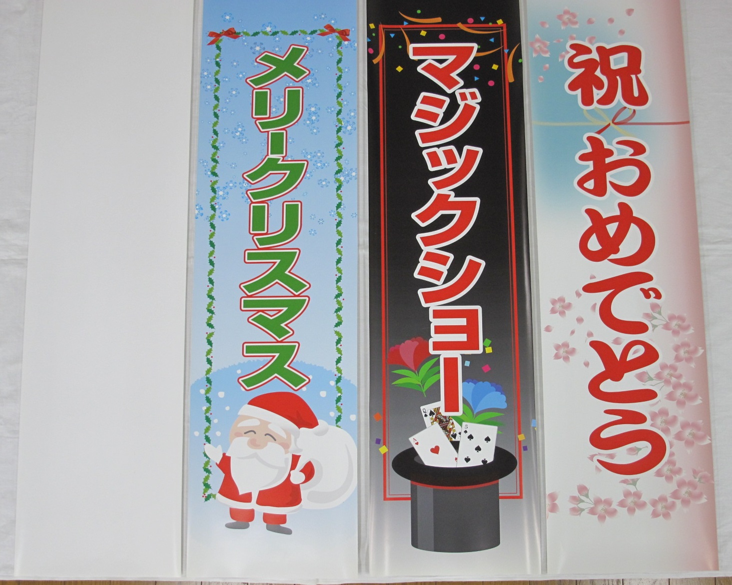 演技の中で、何かメッセージを出すと非常に喜ばれますよね。そこでご紹介するのが、一番重宝する3種類のメッセージと、白紙をセットにした商品です。光沢のある厚紙製で、約28cm×100cmあります。基本丸めてどこかに仕込みパラリと落とすと、メッセージが!しかしこのたれまくだけがあってもどう加工したらよいかわからないという方も多いので、白紙以外の3枚は加工済みで、写真の様に例えば腕の影で持ち、シルクでおまじないをすると一瞬に「マジックショー」のメッセージが出る様にしてあります。なのでこれだけでもマジックになりますが、お持ちのボックス等に仕込んで出したりも可能です。