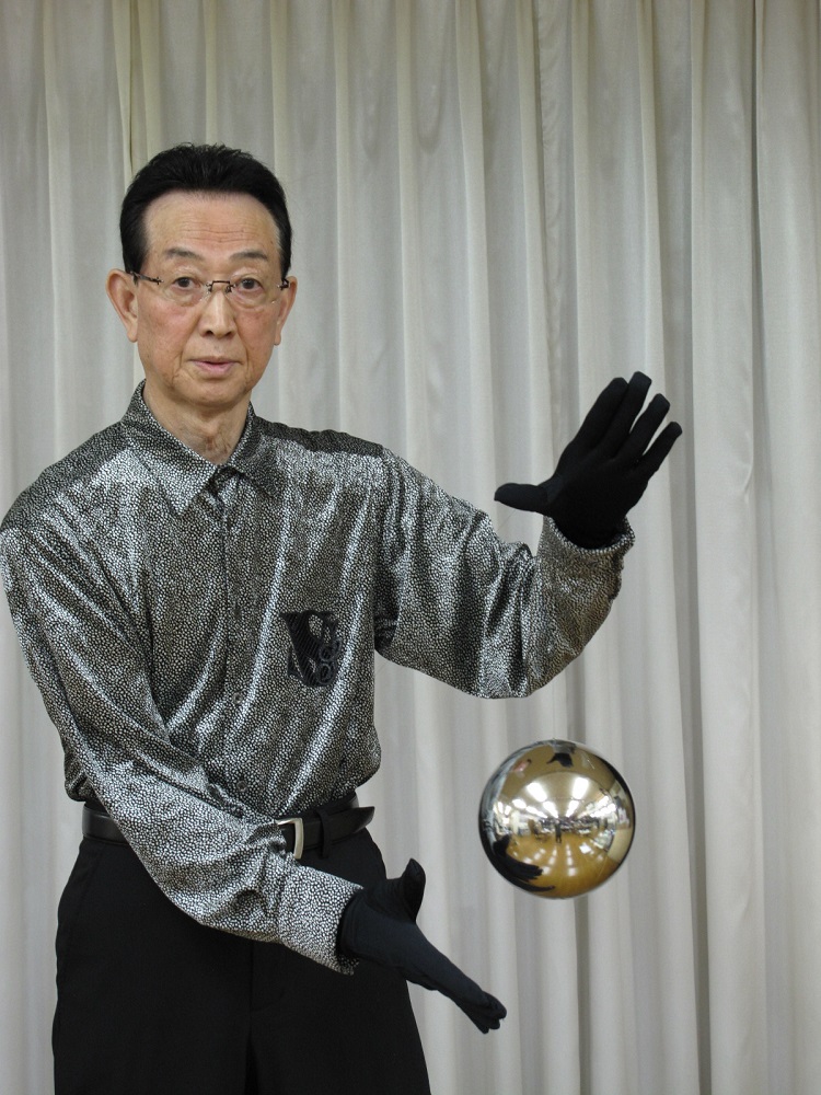 例えば、ボールを持って登場します。そして両手に何もないことを示し、ゆっくりと手を離すと、ボールが宙に浮いています。音楽に乗り左右、上下自由自在にボールが浮遊するのです。写真ではお伝えしきれない不思議さ・優雅さを醸し出してくれます。最後はテーブルに置かれたシルクハットや、付属の台にゆっくりと戻っていき演技を終わります。
