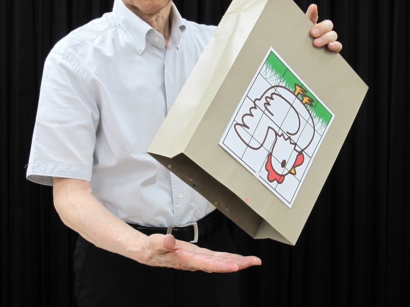 可愛い白いにわとりの絵が描かれた袋があります。裏表、中をよく示します。さらに逆さにしても何もない事も示しましょう。そこでちょっとおまじないをかけると、先程逆さにしても何もなかった袋から、白いたまごが生まれます。なぜ?