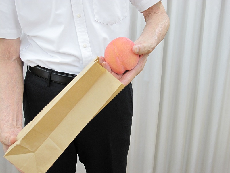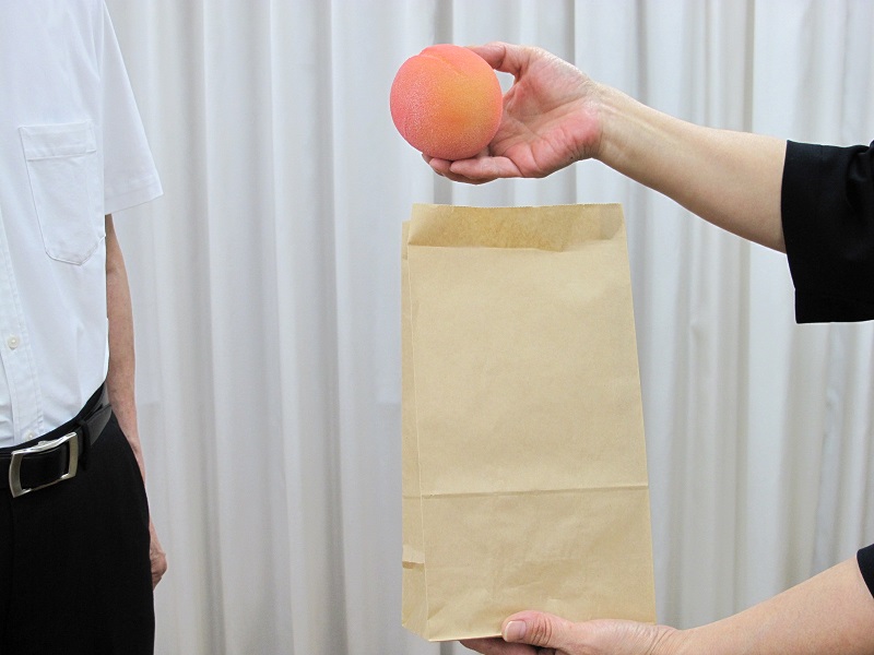 木の枝になっている青い実を採ります。まだ熟していない青い実です。マジシャンが魔法をかけると、青い実が一瞬で立派な桃に成長(変化)するのです。その桃を紙袋に入れ、お客様にプレゼントします。中を開けてもらうと、なんと本物の桃になっているのです。