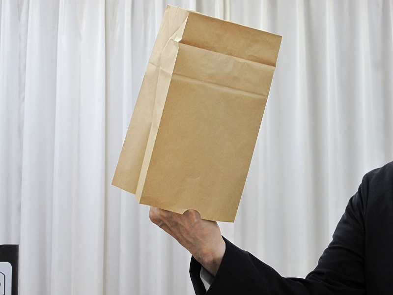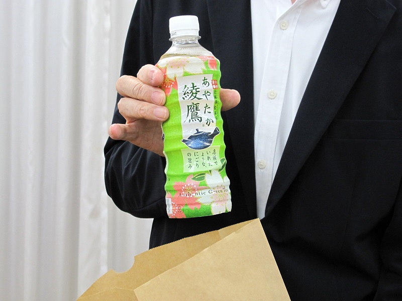何も入っていない紙袋を示します。そしておまじないをかけると、紙袋の中に何やらボトンと音がします。中から、何とちゃんとお茶の入ったペットボトルが出現します。