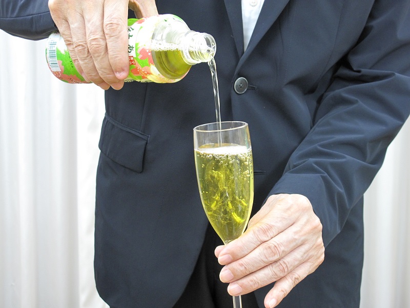 キャップを開けてそのまま飲んで見せても良いですし、観客に振舞ってもOKです。今回は次のマジックに繋げる為に、シャンパングラスに注いで一旦置きます。