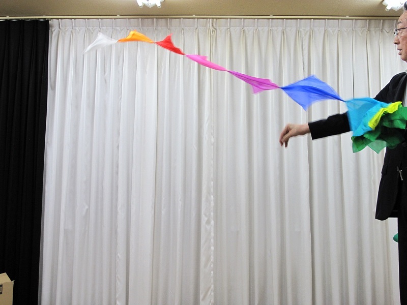 リサイクルのイラストが入った黒い筒を改め、ボトルに被せます。するとボトルがリサイクルされ、緑のシルクの塊に・・・・!それが綺麗なファンテンシルクとなり、ラストはステージいっぱいにシルクが舞います!