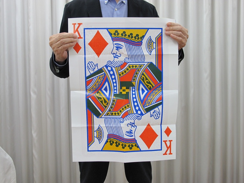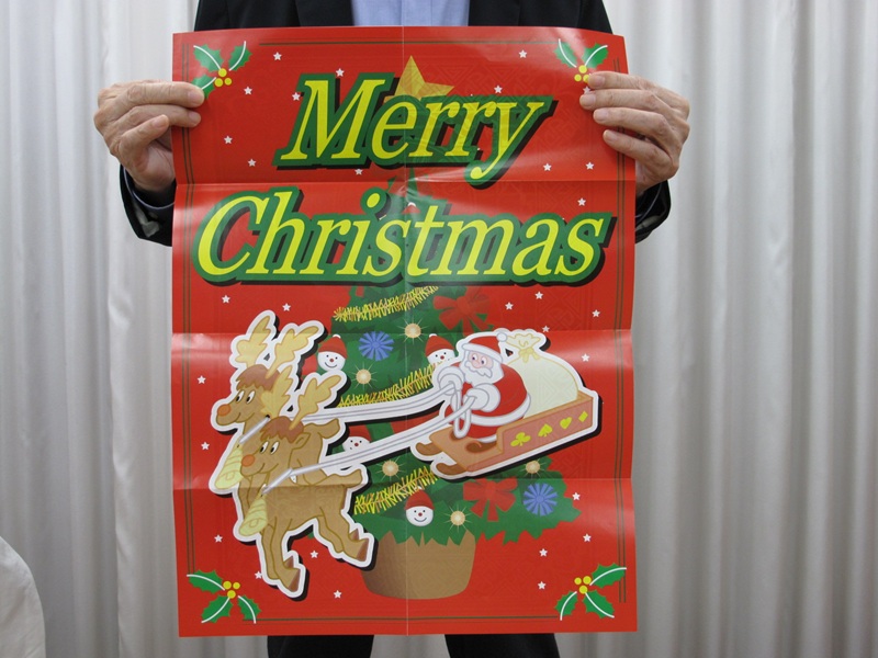 バラバラのシートを示し、重ねて持ちます。そこへおまじないをかけ広げていくとバラバラのシートが消え、1枚のトランプ柄シートになっています。今までの復活シートはここで終わりでしたが、こちらのダブルタイプは、再び折り畳み、クリスマスツリーの描かれたボードでおまじないをかけると何と!トランプ柄が、メリークリスマスのメッセージシートに変化しているのです!