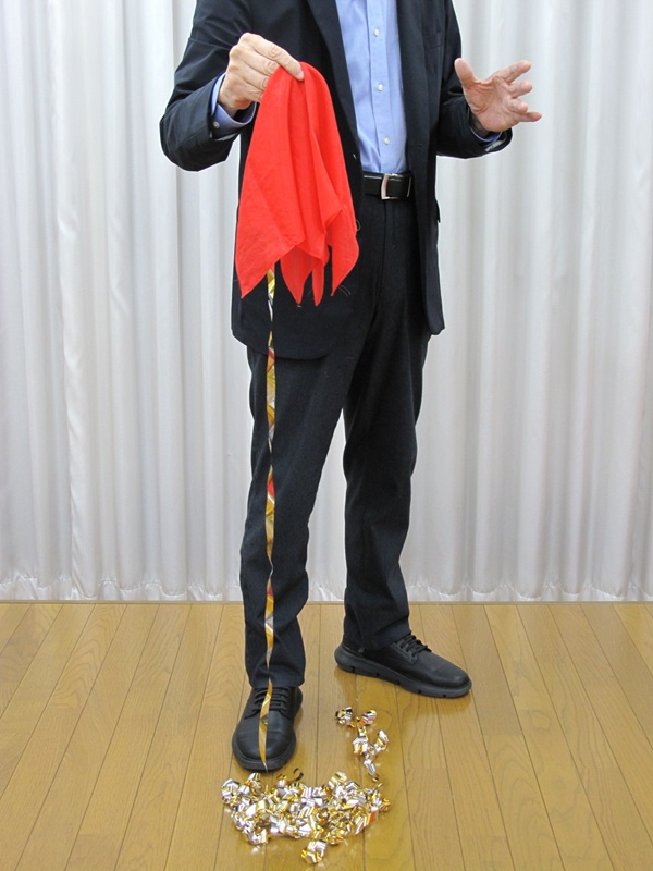 真っ白なお花を持って登場します。白い花びらをとった瞬間に真っ白なシルクがパラリと現れます。そのシルクで白いお花を撫でると一瞬に真っ赤なお花に変化してしまいます。とても鮮やかな現象でインパクト大です。でもこれで終わりではありません。真っ赤なお花をよく示した瞬間にお花が消え、真っ赤なシルクに変化してしまうのです。