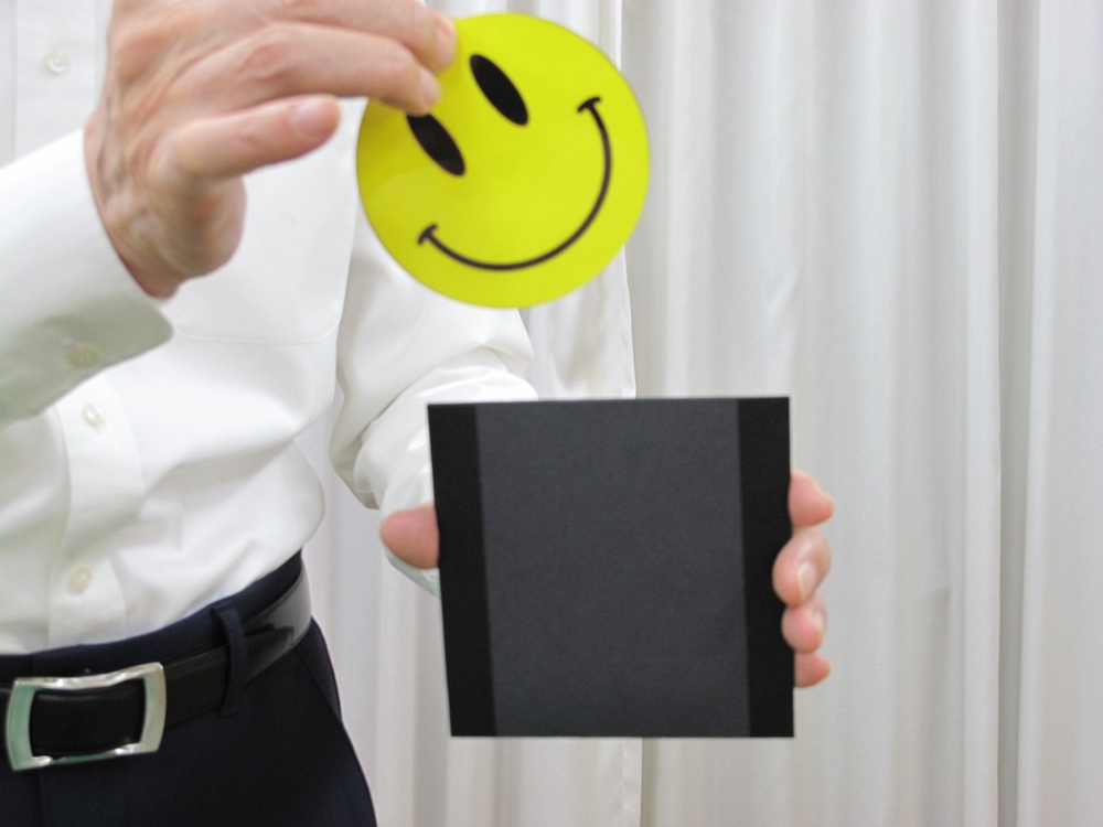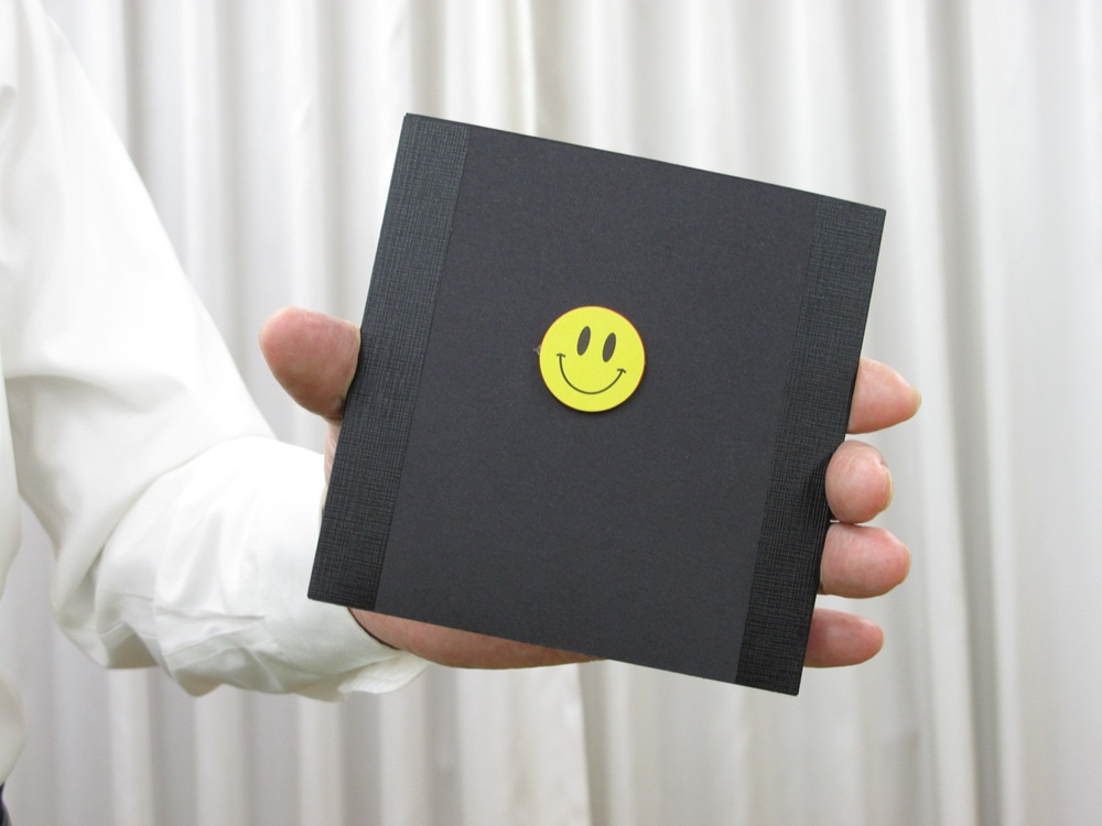 黒いケースに小さなスマイルディスクが付いています。スマイルを取ります。ケースの中は空っぽです。スマイルディスクをケースの中に入れておまじないをかけると・・・・・ディスクは大きくなって出てきます。もう一度、大きくなったディスクをケースに入れておまじないをかけると!!