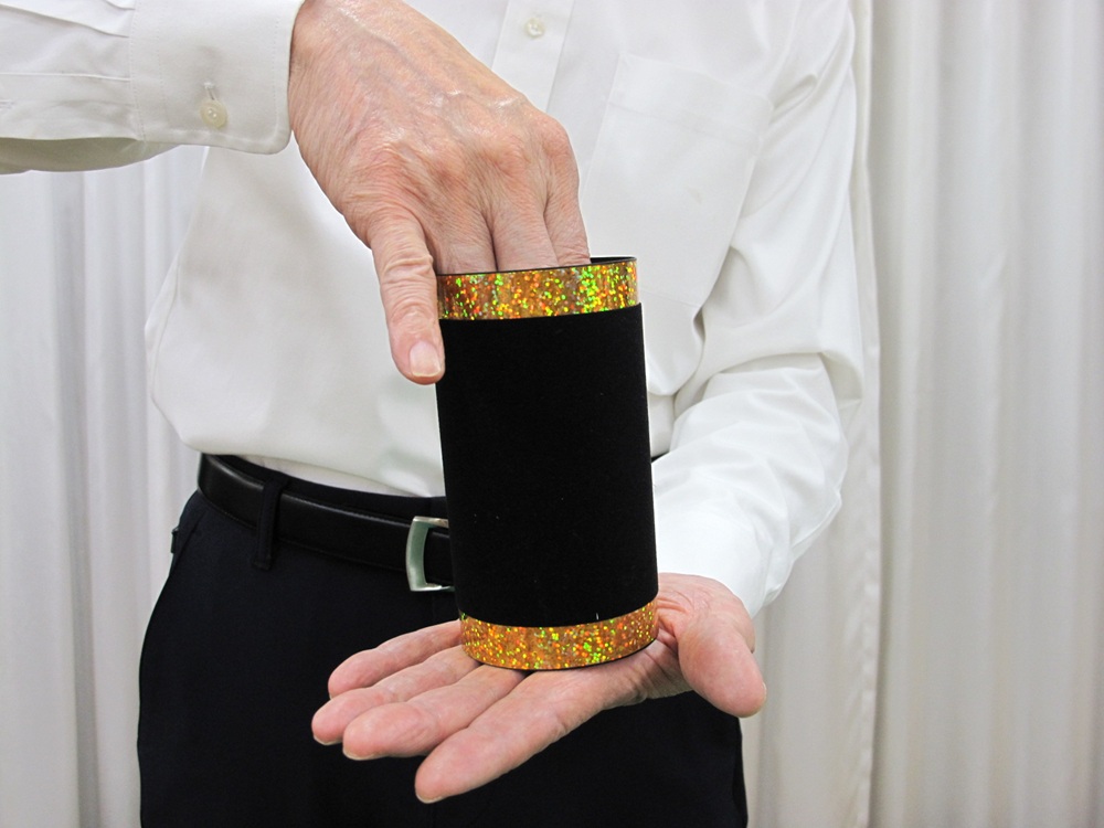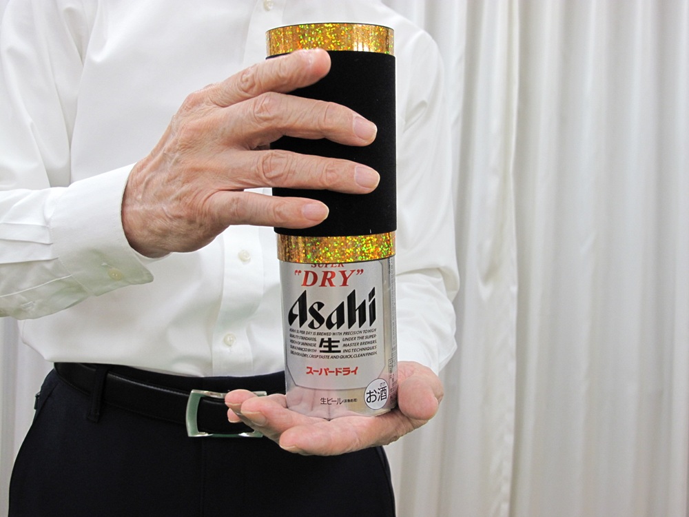 缶ビールを示し、次に黒い空の筒を示し、缶ビールにかぶせます。もう一度筒の中の缶ビールをよく示します。缶ビールに筒を完全にかぶせたらおまじないをかけます。そして缶ビールの上から指先を押し込むと、なんと缶ビールがみるみる縮んでいってしまいます。筒を外すと缶ビールはとんでもなく小さなサイズに変化しているのです。