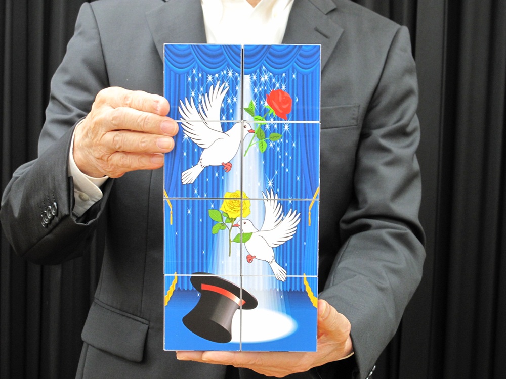 赤い豪華なステージにライトを浴び立っているマジシャンがいます。さあこれからどんなショーを見せてくれるのでしょうか・・・??パタンとキューブを折りたたむと、なんとうさぎちゃんが出てききたパターンに変化します。そして再びキューブを広げると、鳩やバラの花が現れる青いステージに変化!さらにくるりとキューブを返すと、きらめいた黄金のステージに、カードが噴き出しています。さらにさらに折りたたんで見ると、パラソルも出てきちゃいます。そして最後は、「MAGIC」の文字が!!そう、次々とマジックショーが繰り広げられていたのです。