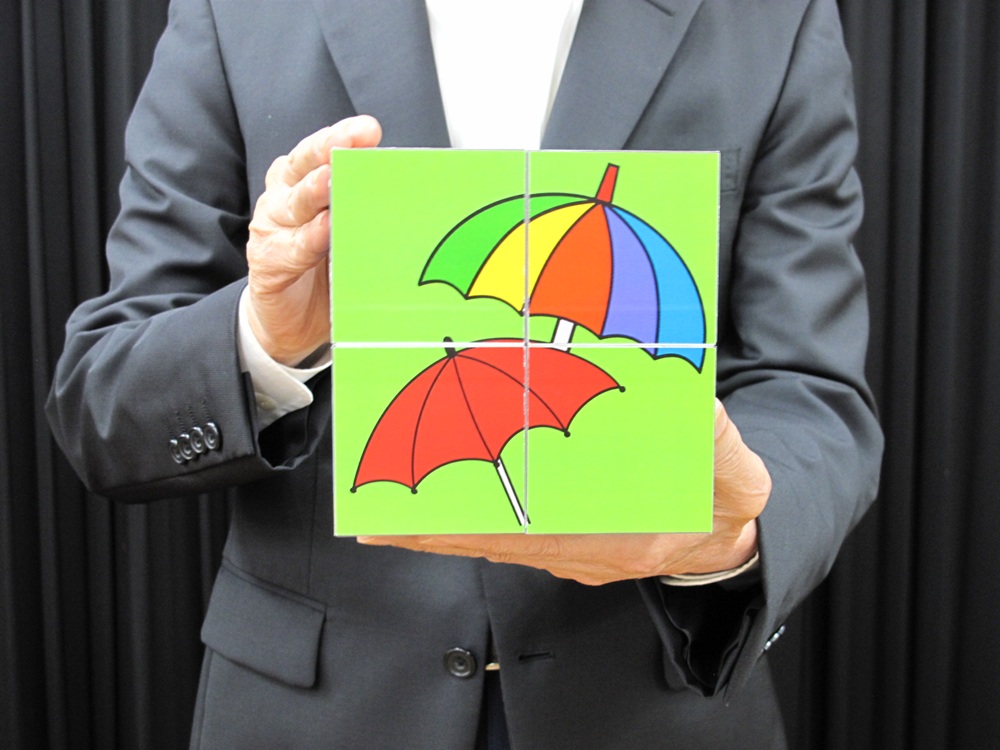 キューブをパタパタと畳んだり広げたり返していくだけで、このように場面(イラスト・色)が展開していくとても不思議なキューブなのです。トークをしながら演じても面白いでしょう。