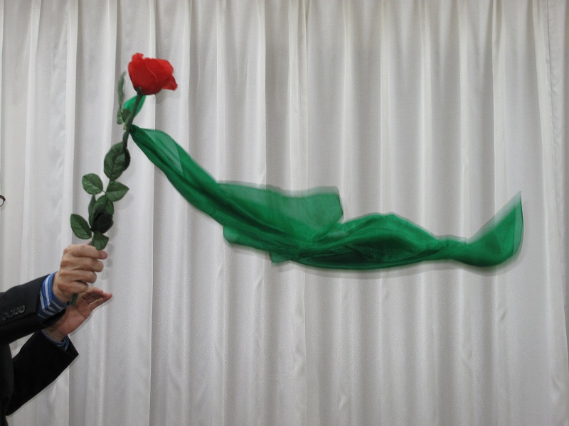 1本の赤いバラから、シルクが飛び出し、そのシルクでおまじないをかけると、バラが発光し、さらに空中浮遊します。
