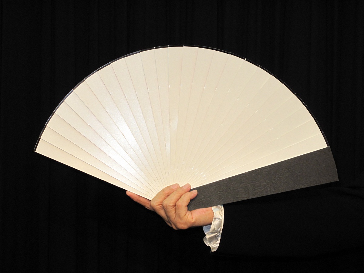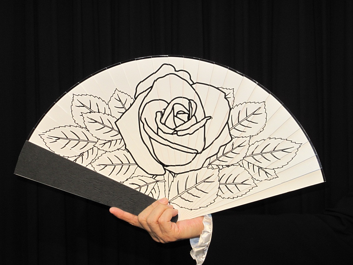 1本の扇子で、白〜線画〜バラ1輪〜バラ3輪といったように、開いて閉じてを繰り返すだけで、次々と変化していきます。とても鮮やかで綺麗な扇子の演技になります。