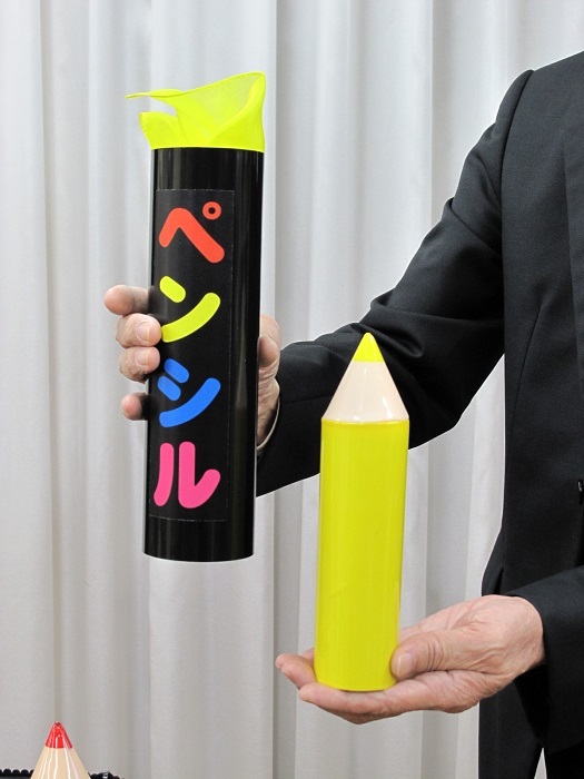 赤い1本の大きなペンシルがあります。そこへ中を改めた筒を被せ、黄色いシルクで撫でてあげると、なんと黄色いペンシルに変化!そして今度はまた筒を被せ青いシルクで撫でてあげると、青いペンシルに変化して行きます。さらに、筒を被せおまじないをすると・・・・!ペンシルが、カラフルなファンテンシルクに変化して、そのファンテンは、ステージ綺麗に舞います。