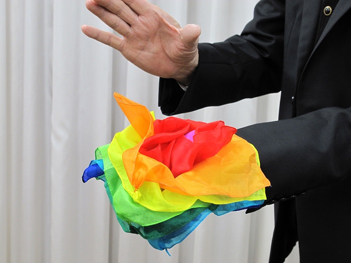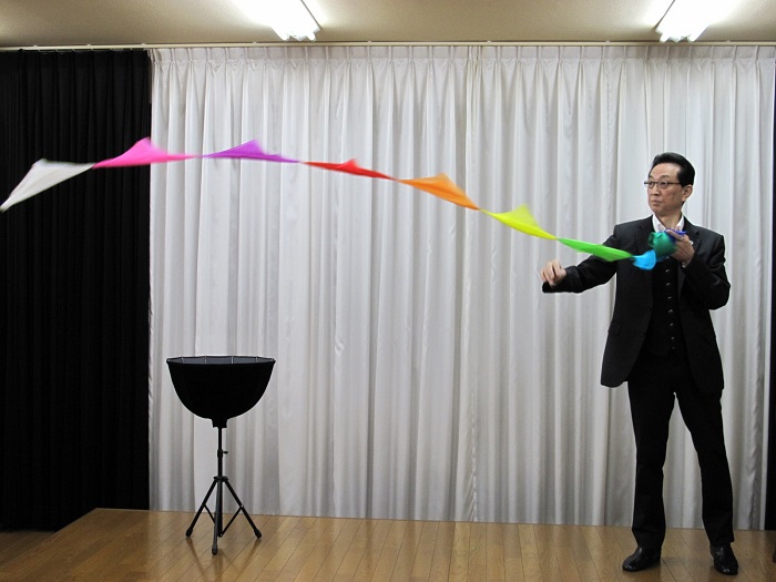 ここまでが、セットの演技です。さらに続けたい方は、シルクを手繰り寄せ、クス玉等を出しても良いでしょう。