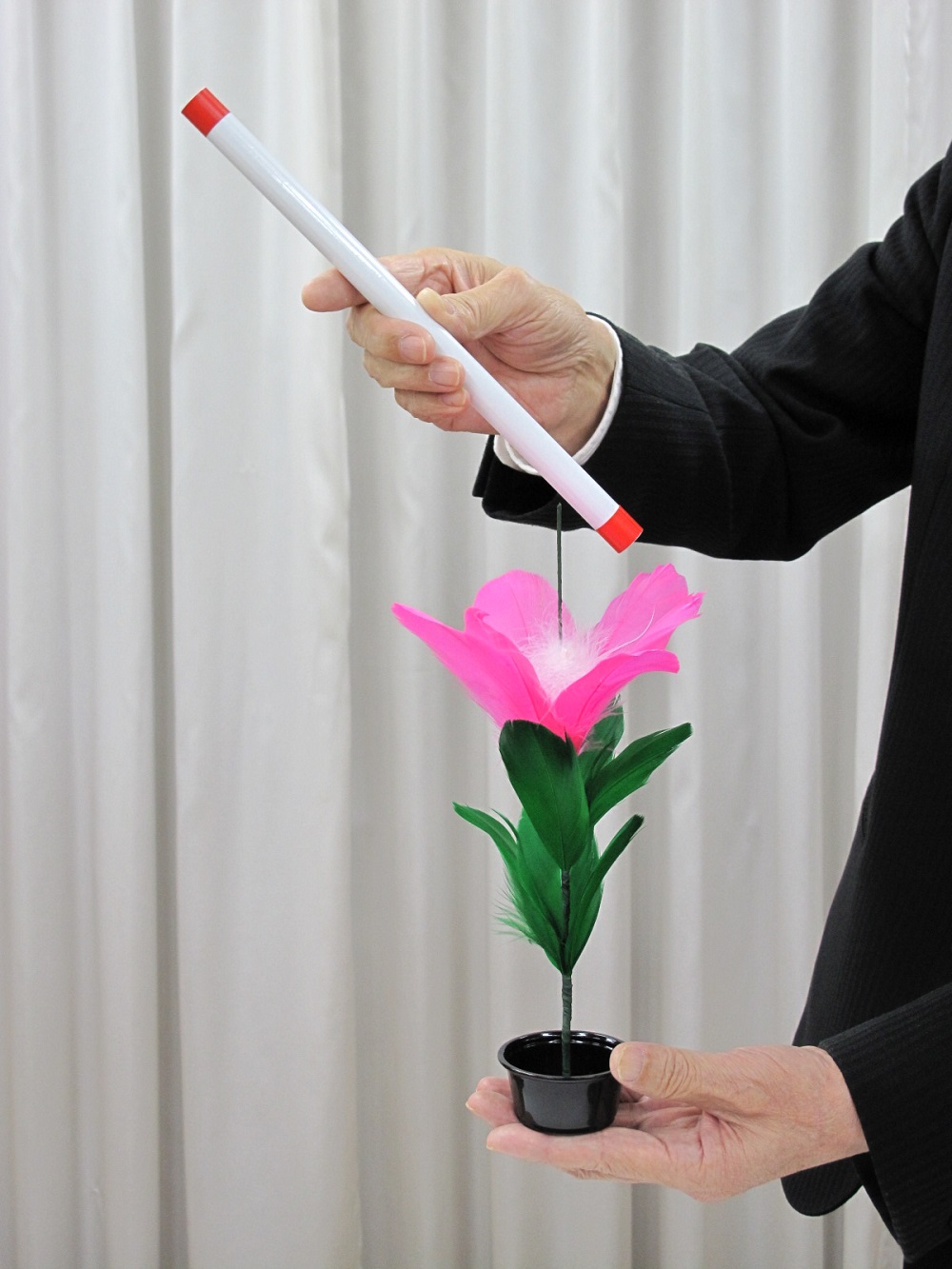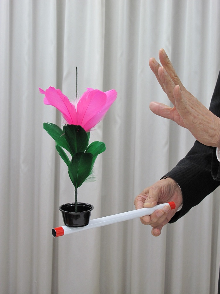 1本のウォンドと、鉢があります。鉢におまじないをかけ、ポンとウォンドで叩くと、鉢に可愛いお花が咲きます。ここまでは、よく見る現象ですね。でもこの商品は、お花が咲いた鉢ごと、ウォンドの上で浮かせる?ことが出来るのです。バランス芸は普通超難しいのですが、このフラワー は誰でも簡単に出来ちゃいます。高さ約28cmでお花も大き目で見栄えがします。 *お花の色は、黄色とピンクがあります。 【セット内容】 ・ウォンド ・お花1本 ・鉢 ・解説書