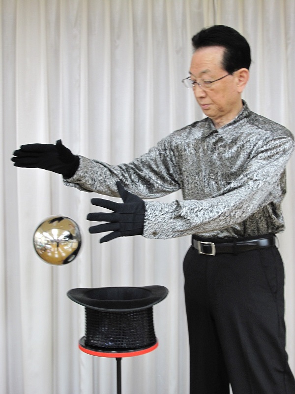 例えば、ボールを持って登場します。そして両手に何もないことを示し、ゆっくりと手を離すと、ボールが宙に浮いています。音楽に乗り左右、上下自由自在にボールが浮遊するのです。写真ではお伝えしきれない不思議さ・優雅さを醸し出してくれます。最後はテーブルに置かれたシルクハットや、付属の台にゆっくりと戻っていき演技を終わります。