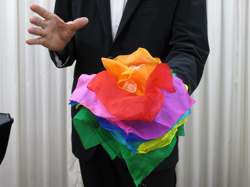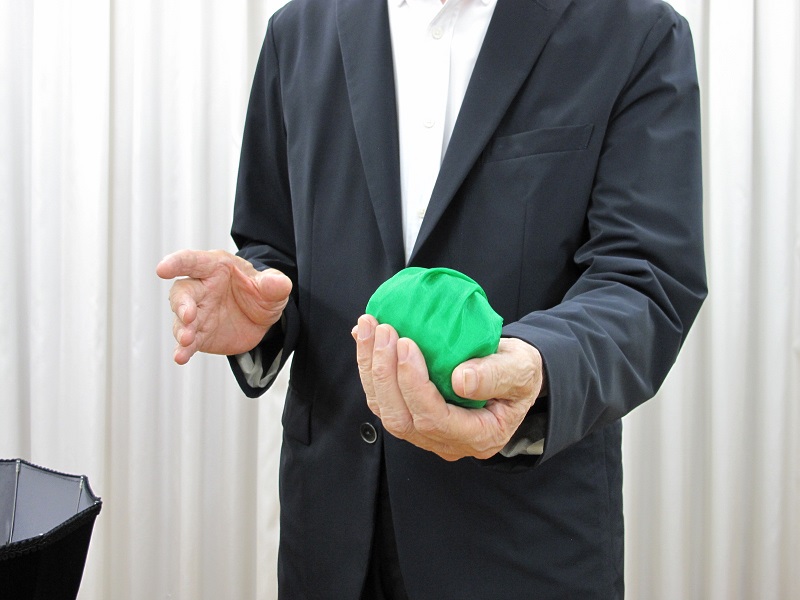 リサイクルのイラストが入った黒い筒を改め、ボトルに被せます。するとボトルがリサイクルされ、緑のシルクの塊に・・・・!それが綺麗なファンテンシルクとなり、ラストはステージいっぱいにシルクが舞います!