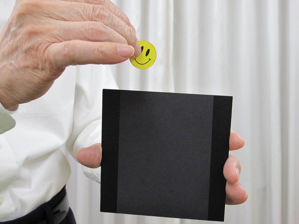 黒いケースに小さなスマイルディスクが付いています。スマイルを取ります。ケースの中は空っぽです。スマイルディスクをケースの中に入れておまじないをかけると・・・・・ディスクは大きくなって出てきます。もう一度、大きくなったディスクをケースに入れておまじないをかけると!!
